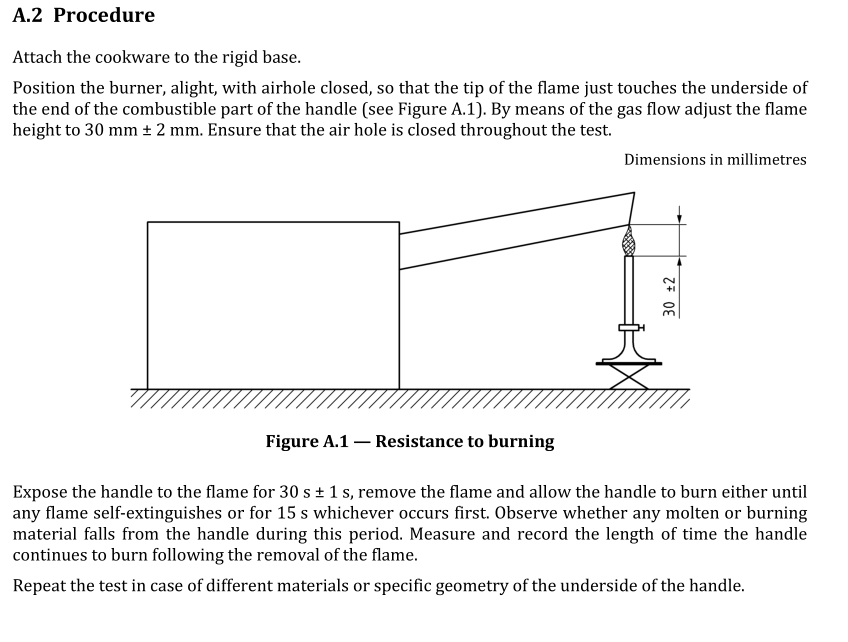 The kitchenware industry commonly uses a test, from BS EN 12983-1 2023 cookware standard regulations, to assess how flammable the material of a handle is to a candle flame set underneath it. For a pass to be awarded no visible sign of molten or burning material should have melted or dripped off the handle, after it has been heated for 30 seconds. In addition, once extinguished the handle material should not spontaneously re-ignite.