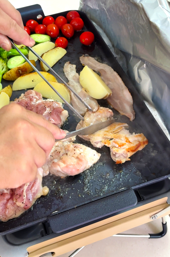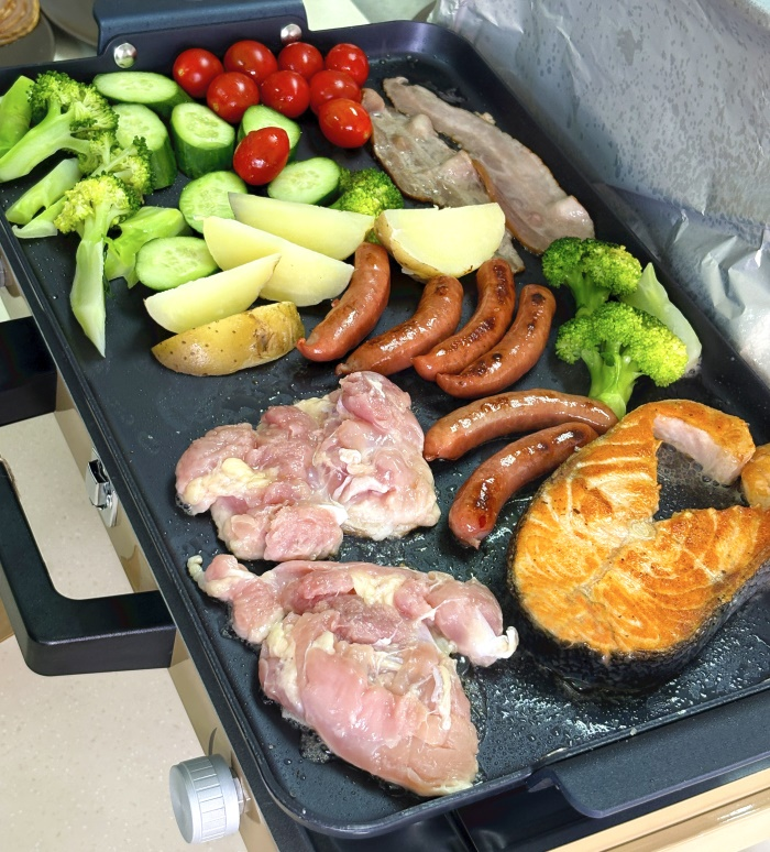 Double burner griddle not only can cooking teppanyaki with metal utensil, but also cooking hamburger steak, small piece meat, shrimp, fish…
