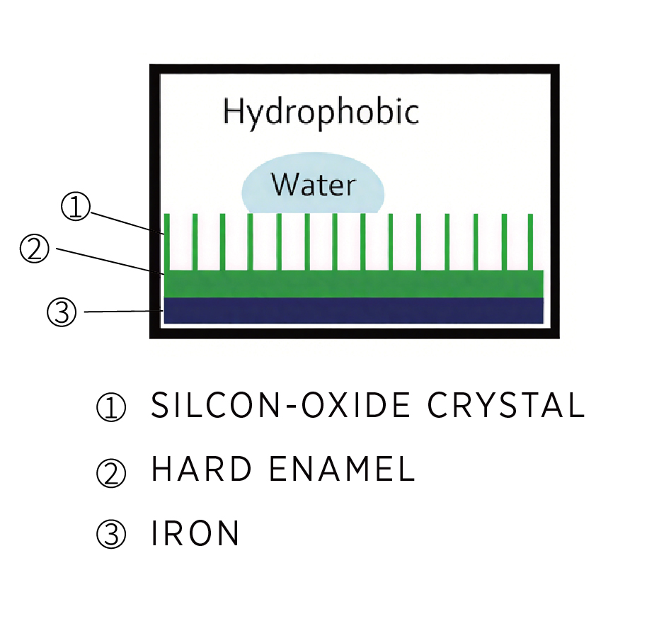 1) Lotus Rock’s surface is a specially configured design which has very high heat resistance. Most general non-stick cookware, which is organic-bonded, can easily break under a high temperature. This can, consequently, create a harmful chemical smoke which is bad on environmental and health grounds. In contrast the Lotus Rock silicon-oxide coating is made up of inorganic substances: it is in the form of a thin crystal, which has no traces of carbon within it. Conversely, the type of ceramic material that the silicon-oxide coating rests on can resist temperatures of up to 350 degrees centigrade, which is particularly advantageous for frequent, intensive cooking.